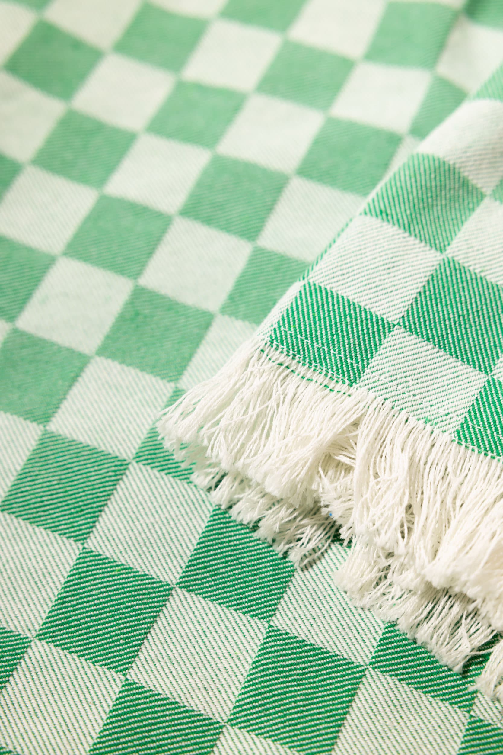 The materials used to create the Check Throw are a mix of recycled polyester and recycled cotton.